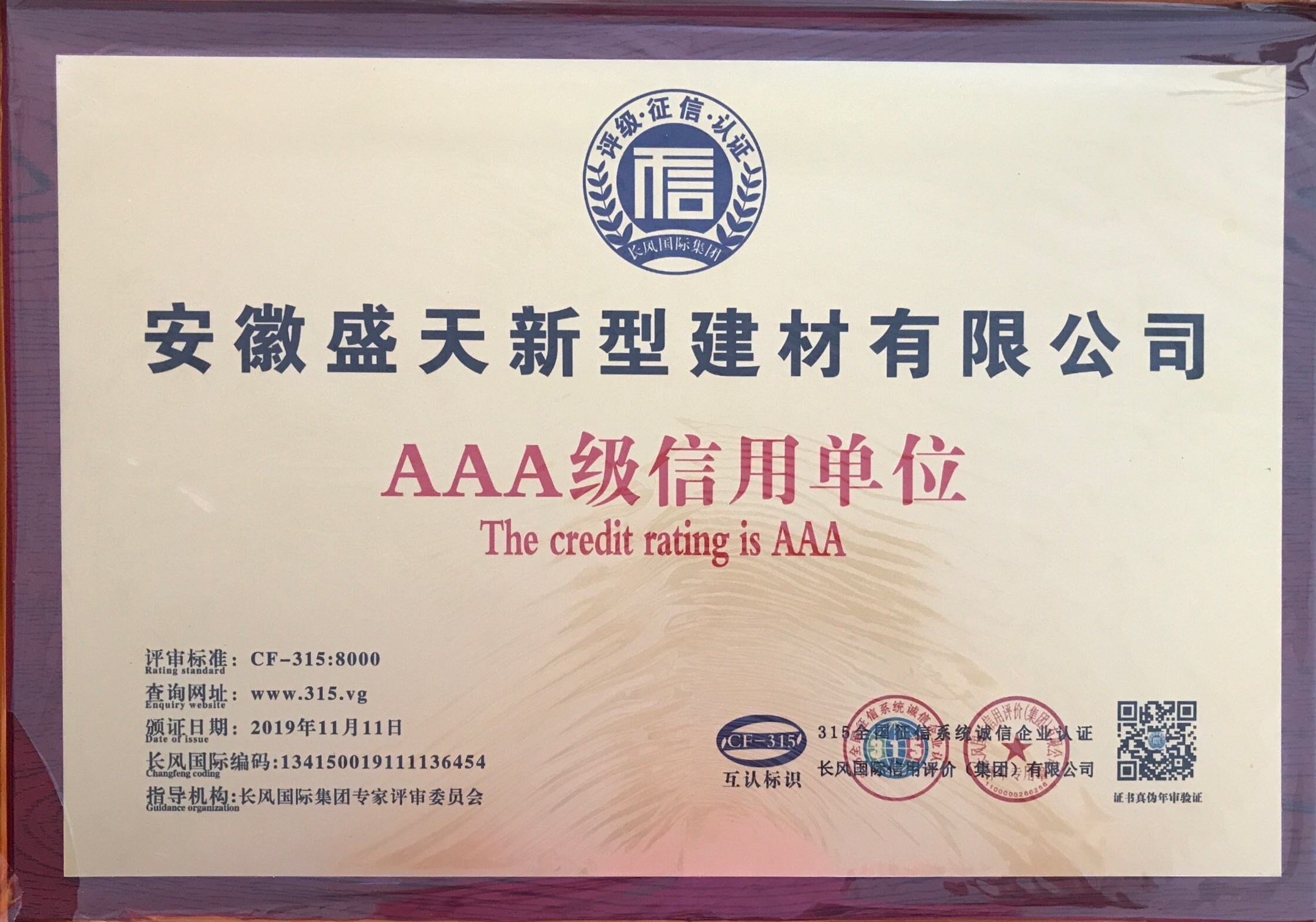 安徽盛天資信等級(jí)被評(píng)為AAA級(jí),被列為“重合同 守信用”單位。